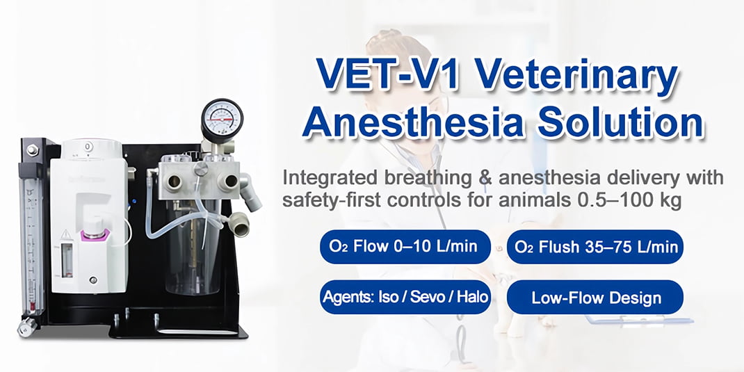 VET-V1 veterinary anesthesia machine delivers precise gas mixtures to safely sedate animals up to 100 kg, ensuring stable respiration and anesthesia depth.